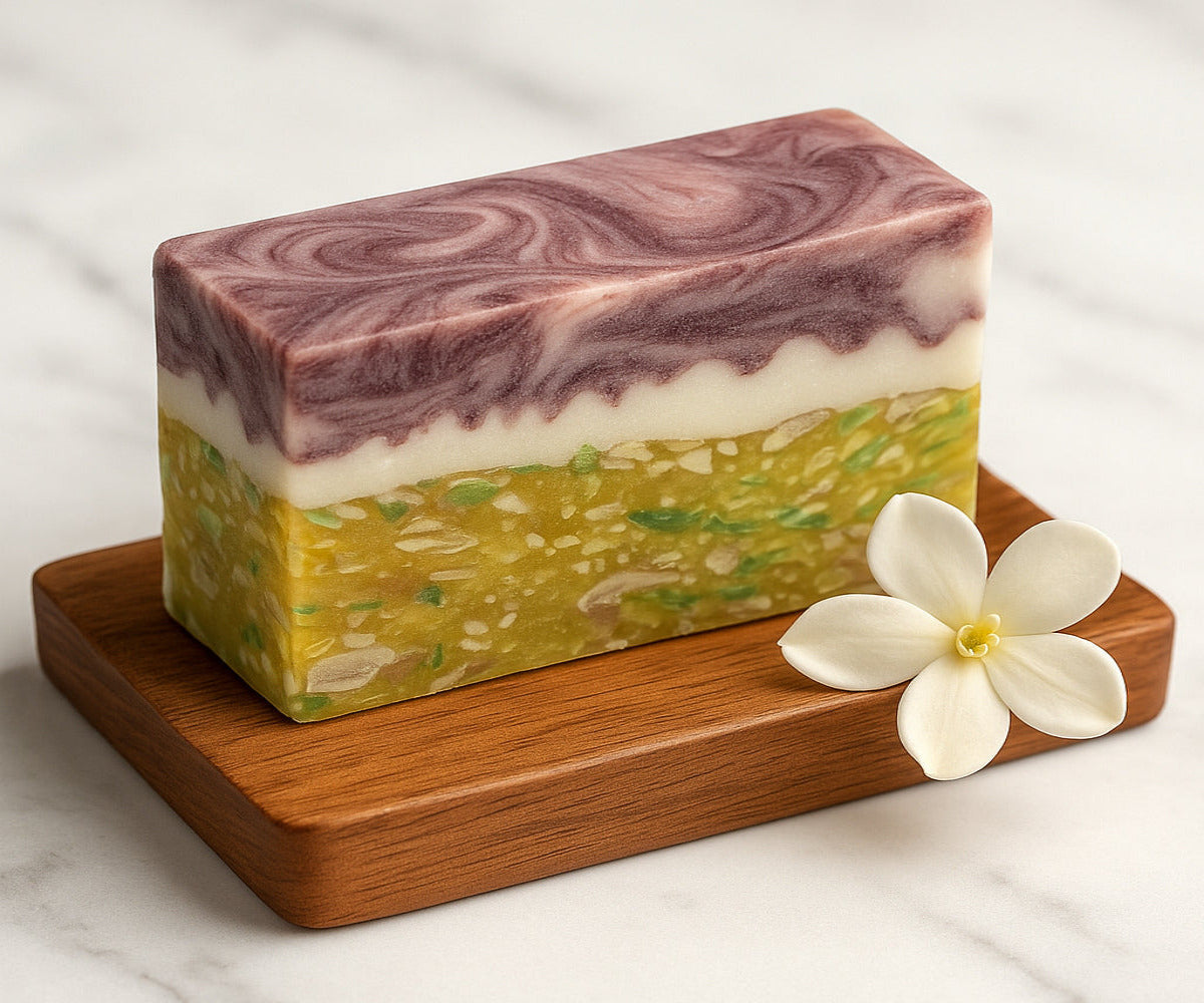 🎨 Bezauberndes Design: Die Schichten in Grün-, Gold- und Violetttönen machen diese Seife nicht nur zu einem Pflegeprodukt, sondern zu einem Kunstwerk für Ihr Badezimmer!